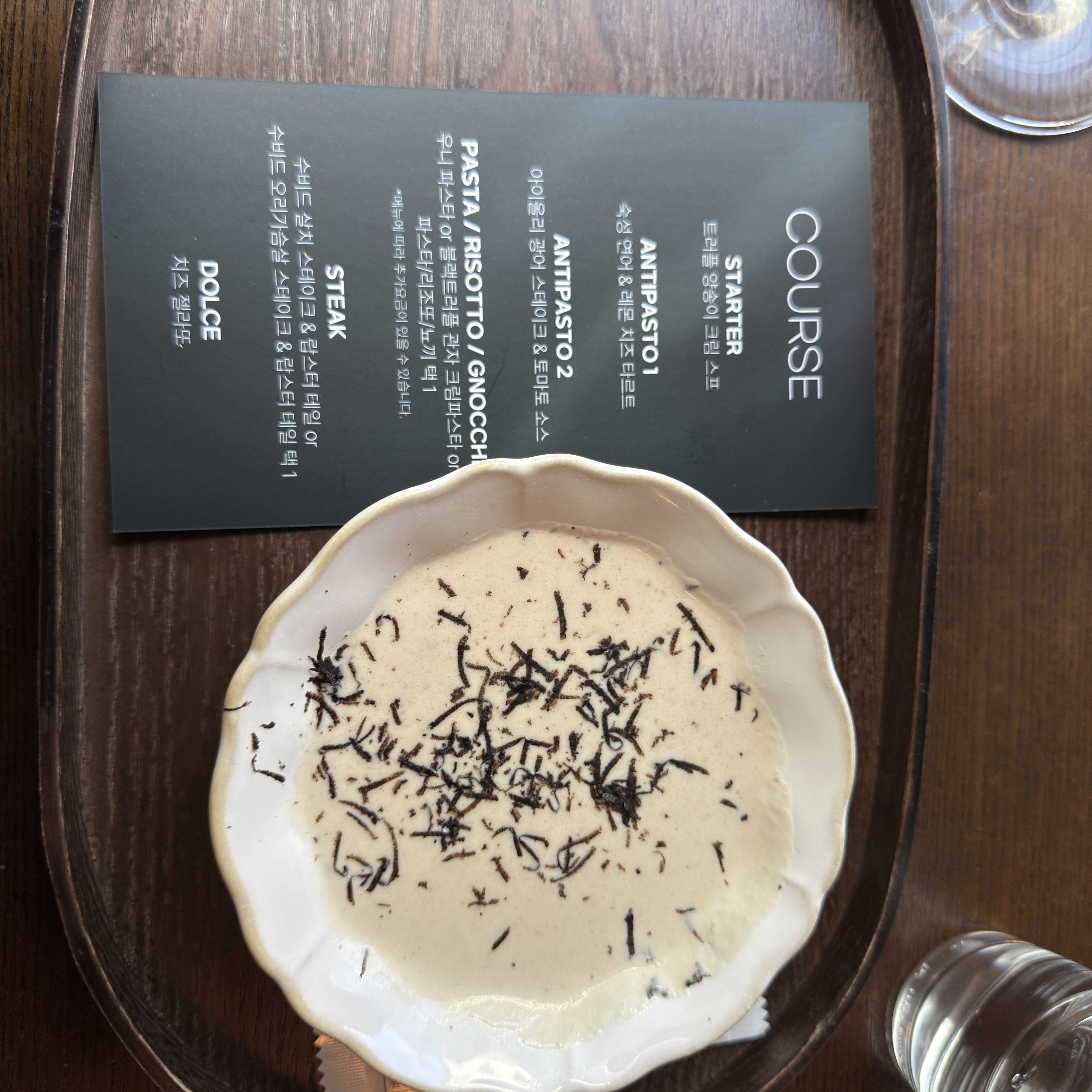 • 스프: 부드럽고 트러플향이 전해지는 고소한 맛. 입맛을 깔끔하게 돋워줌.